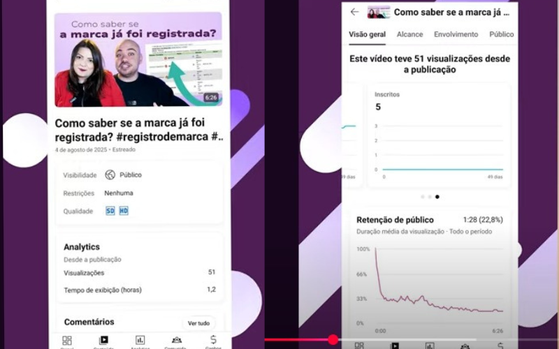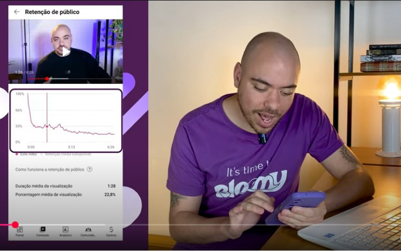 Com ele, você tem na palma da mão todas as métricas do seu conteúdo. O painel no computador é bastante parecido, mas o aplicativo facilita o acesso rápido e prático.